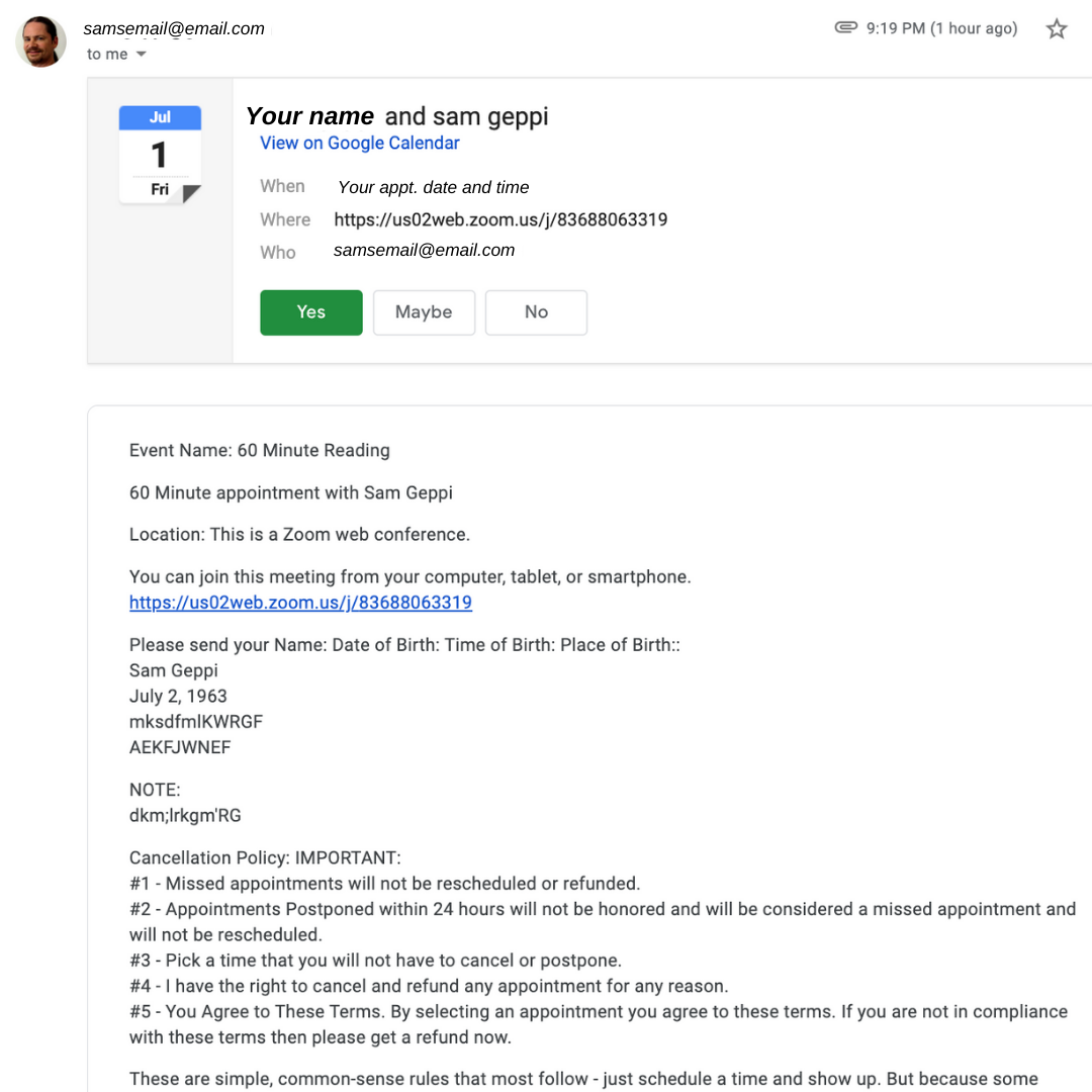 The email is a record of the form you submitted and the zoom link that you need to click in order to attend your reading. Below is an example of the email you will be sent, if you have a gmail account. But it will look similar in all email providers.
